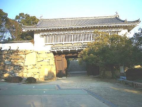 本丸の北側から中の段に上るための裏(搦手)門である。本段の張出部から中の段にかけて上屋が渡され、その下に門扉を設けた櫓門の型式をとっている。上屋は、本段御殿に住む藩主が中の段の表書院に降りる道筋に当たり、この門の名の起こりとなった。月見櫓と同じく1620年代に池田忠雄が建てたものであるが、明治になって取り壊された。現在の建築は昭和41(1966)にコンクリートで再現されたものである。なお、30mほど背後の中の段内に廊下門の前身となる裏門跡が埋め込まれている事が、発掘調査で判っている。(岡山市 教育委員会 HP岡山城本丸探訪より)