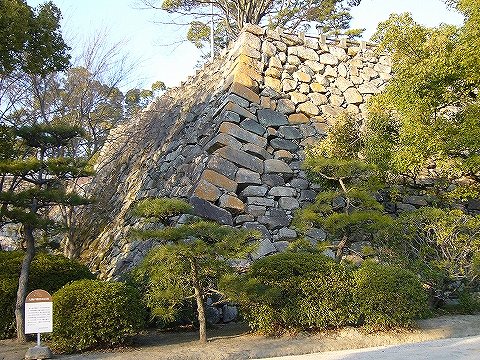 石垣 右隅は宇喜多秀家期の石垣に被せて造られており、関ヶ原合戦後の小早川秀秋期か前池田期に築かれたものとみられる。上部は不明門を建てた時に積み足され、中位の一部は天保9年(1838)に崩落して修理を受けている。 (岡山市 教育委員会 HP岡山城本丸探訪より)