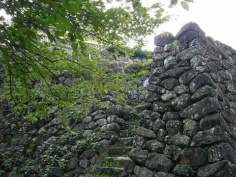 石垣は、石を立てず、横に寝かせ、大きい石を奥に押し込んで積む、野面積み工法で積まれています。
