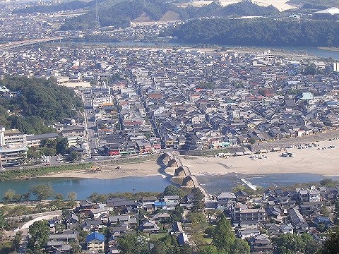 写真真ん中山頂に岩国城、左にロープウェイの山頂駅が見えています。